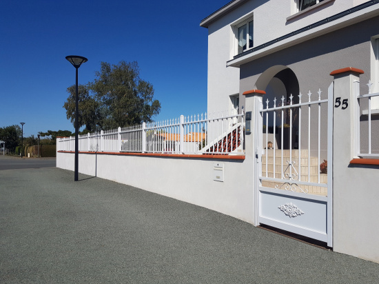 Le design et les éléments qui composent le portail, le portillon et la clôture de cette propriété évoquent clairement le style des portails en fer forgé, tout en présentant un esthétisme moderne et épuré. Tous sont vêtus d’une couleur blanche, comme le mur et la maison, ce qui donne à l’ensemble une apparence harmonieuse et fraîche. Les différents produits nous laissent entrevoir la somptueuse maison se trouvant dernière, offrant ainsi une vue charmante et accueillante.